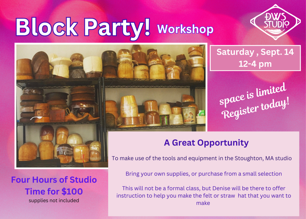 A Great Opportunity to make use of the tools and equipment in the Stoughton, MA studio Bring your own supplies, or purchase from a small selection This will not be a formal class. Denise will be there to offer instruction to help you make the felt or straw hat that you want to make.