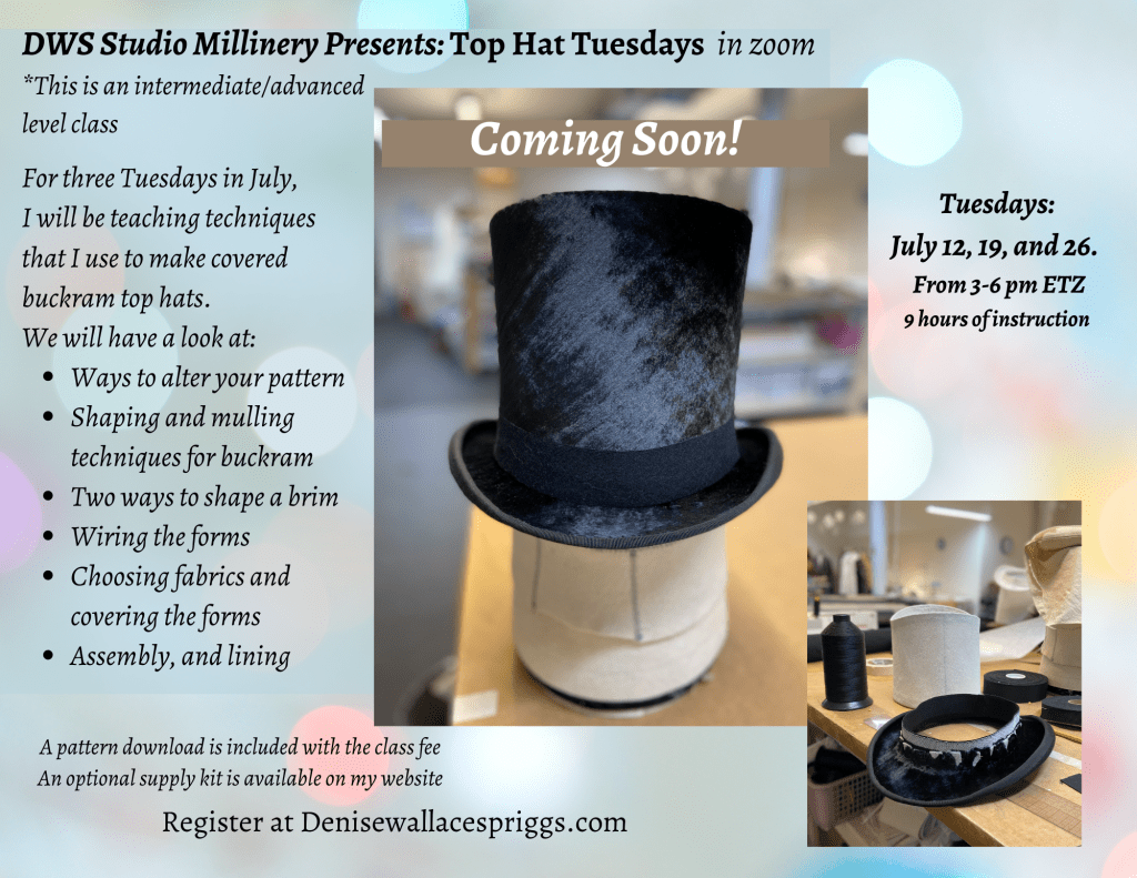 Due to the outbreak of COVID 19, DWS Millinery will not be offering in person classes at this time. Stay tuned while we try our best to work on some video tutorials!